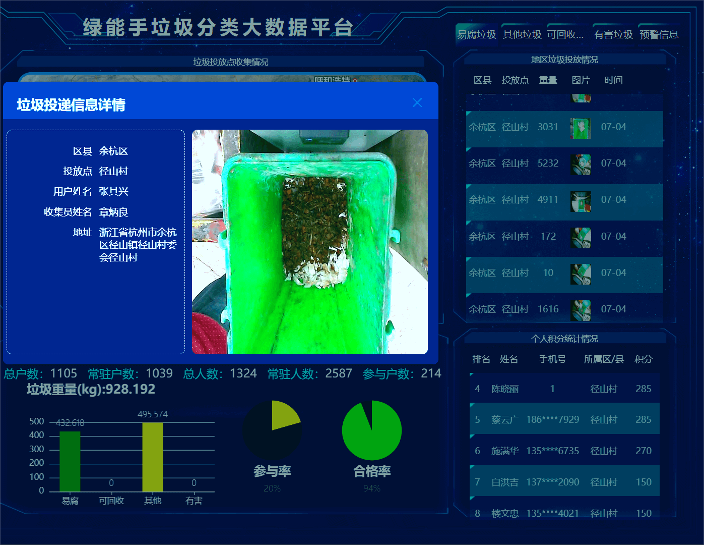 呈现居民垃圾投放信息、重量、积分、实图、参与率合格率、清运情况、清运车行程轨迹、满溢报警
